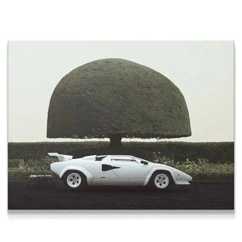 Step into a world of curated exclusivity and vintage automotive glamour with this striking fine art print, titled '6 am In Hamptons'. This piece perfectly encapsulates the juxtaposition of powerful machinery and serene, meticulously maintained landscapes. Featuring an iconic white Lamborghini Countach parked dramatically beneath a monumental, dome-shaped topiary, the atmosphere is quiet, moody, and utterly luxurious. It evokes the feeling of an exclusive early morning departure or arrival, shrouded in mist and privilege.