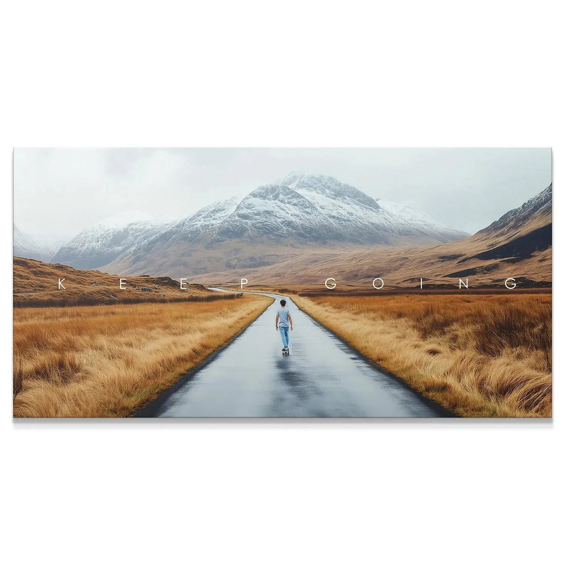 Embrace the challenge and the journey with this captivating canvas print titled 'Action Sports - Keep Going'. This stunning visual captures the essence of motivation, depicting a solitary figure cruising on a long, wet highway toward majestic, snow-capped mountains nestled within a rugged valley of golden fields. It’s more than just decor; it's a daily reminder to persevere, perfect for the home gym, office, or living space where inspiration is key.