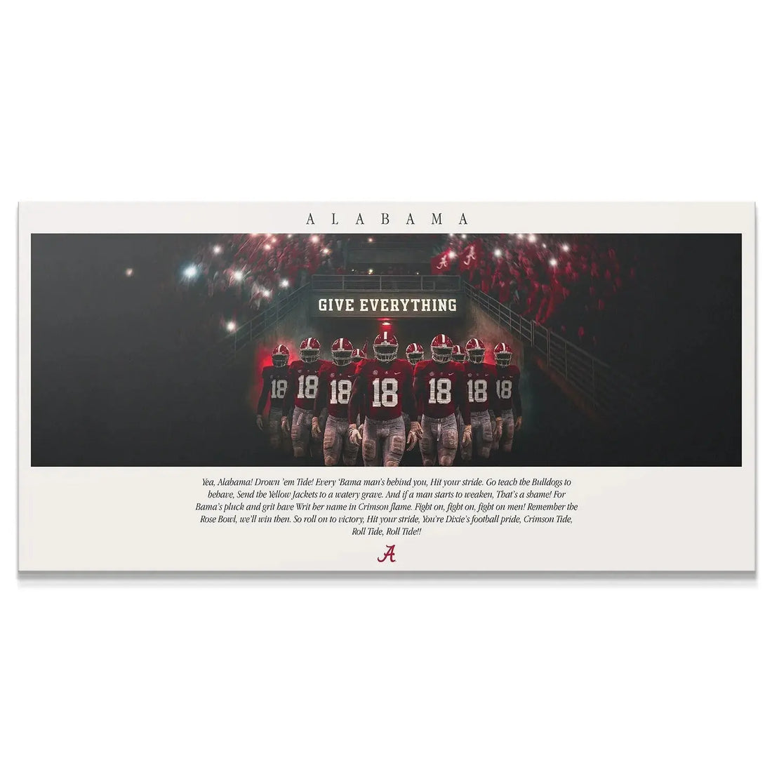 Celebrate the unmatched spirit of the Crimson Tide with this inspiring wall art featuring the iconic Alabama - Fight Song. This premium print captures the intensity and tradition of game day, showcasing a powerful visual of the team poised to take the field, embodying the mantra "GIVE EVERYTHING." It is the perfect piece for any dedicated fan, alumni, or student looking to bring the energy of Tuscaloosa into their home or office. The design masterfully blends cinematic photography of the players in their crimson jerseys with the historic text of the fight song lyrics, "Yea, Alabama! Drown 'em Tide! Every 'Bama man's behind you..."