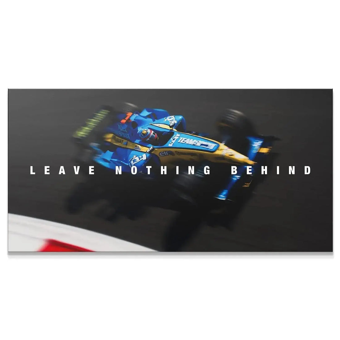 Capture the raw, uncompromising spirit of motorsport with this stunning dynamic print, titled 'Alonso - Leave Nothing Behind'. This limited-edition artwork pays homage to the relentless drive and determination of Fernando Alonso, freezing a moment of high-speed action where precision meets velocity. The visual features an iconic blue and yellow livery race car captured with a dramatic motion blur, symbolizing the sheer speed and dedication required at the pinnacle of racing. The philosophy "Leave Nothing Behind" is starkly overlaid, turning this piece from mere decoration into a powerful statement of commitment and focus.