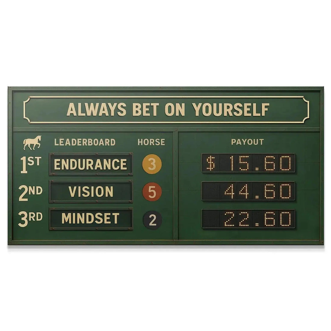 Celebrate ambition and self-belief with this distinctive vintage-style scoreboard wall art. Declaring "Always Bet on Yourself" across the top, this piece serves as a potent motivational anchor for any home office, executive environment, or living space. The artwork beautifully merges the excitement of the race track with profound personal development principles, emphasizing that the greatest rewards come from cultivating internal strength and making the choice to Always Bet on Yourself.