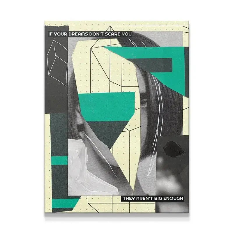 The 'Big Dreams Scare' modern collage captures the powerful feeling of pursuing truly audacious goals. This striking contemporary piece combines fragmented black and white photographic imagery with stark geometric lines and bold teal accents, making it a compelling focal point in any contemporary setting. It serves as a daily affirmation that meaningful achievement often requires stepping outside your comfort zone and embracing the fear of the unknown. If your goals don't give you pause, perhaps they aren't challenging enough. Owning the 'Big Dreams Scare' message means committing to relentless self-improvement and embracing complexity.