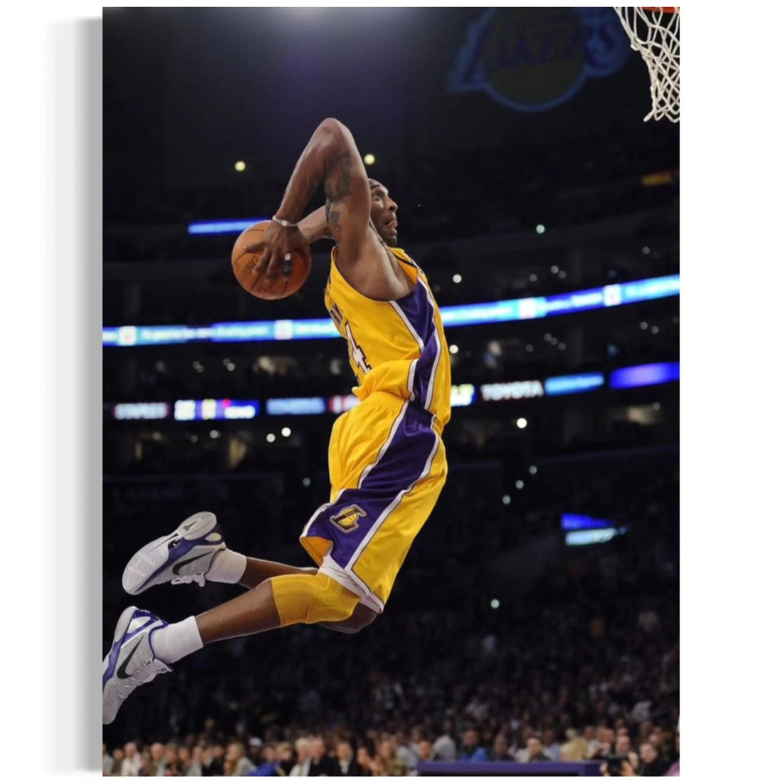 Bring the Mamba mentality into your space with this stunning Kobe Bryant slam dunk canvas wall art. Captured mid-air in his iconic Los Angeles Lakers jersey, this artwork celebrates Kobe’s unmatched athleticism, determination, and legacy as one of basketball’s greatest.