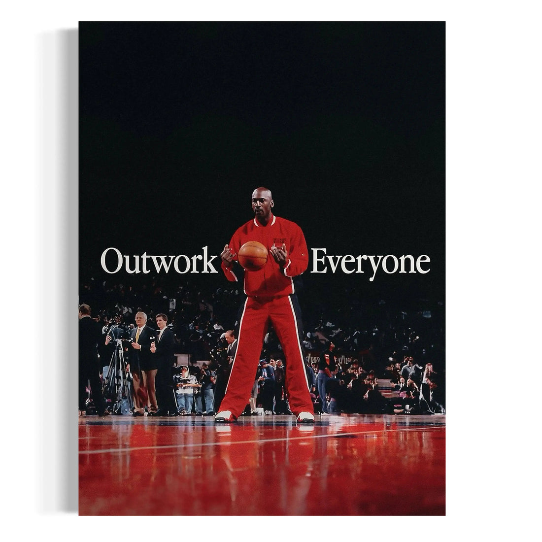 Push yourself to greatness with this powerful Michael Jordan motivational wall art featuring the GOAT in his iconic red warm-up suit. With the bold phrase “Outwork Everyone” across the design, this canvas captures Jordan’s legendary mindset and drive to be the best.