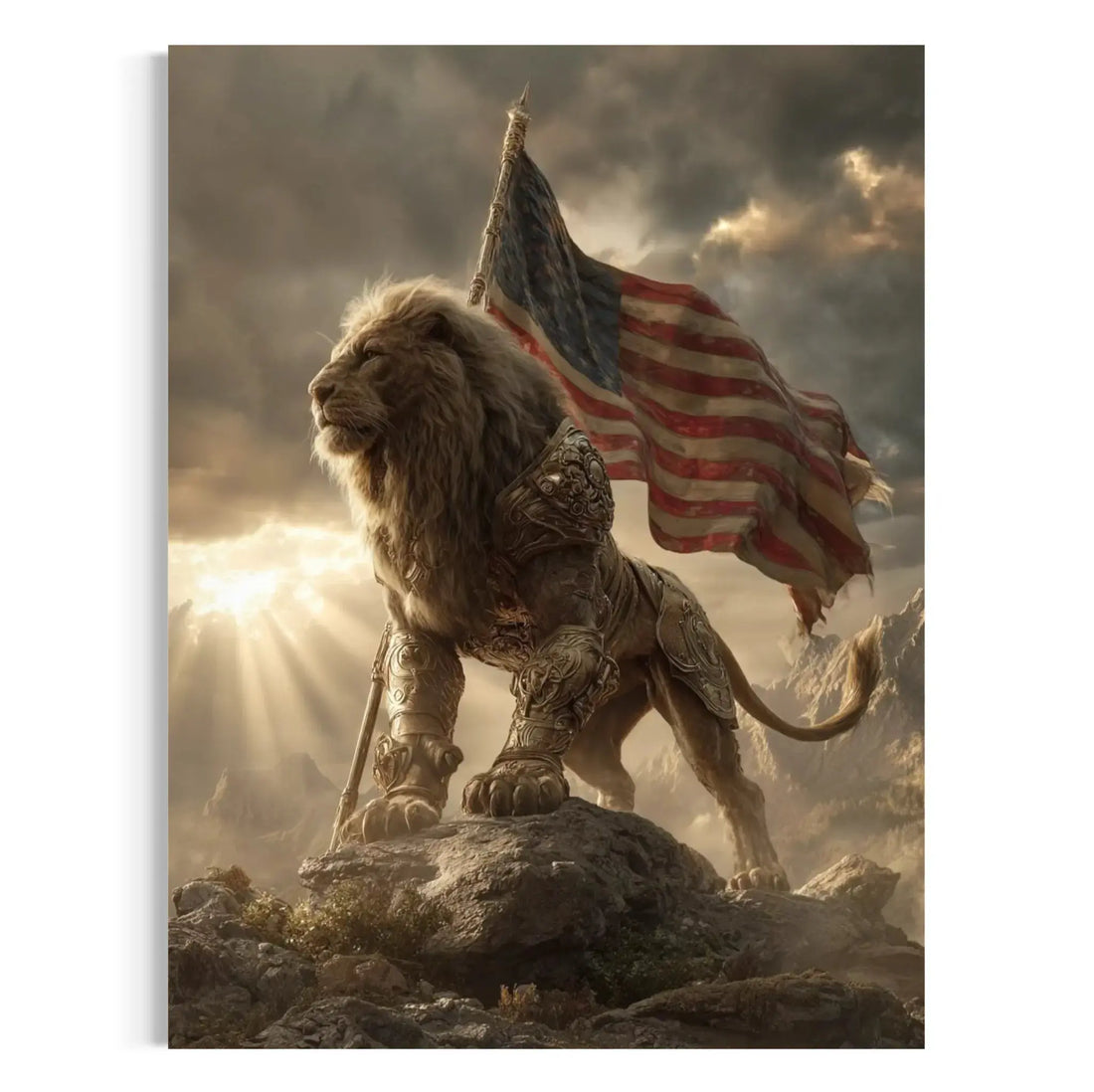 This lion canvas wall art captures the spirit of strength, freedom, and honor in a single breathtaking image. Featuring a powerful lion standing tall in regal armor with the American flag waving behind him, this artwork speaks to courage and patriotism. The sun breaks through stormy clouds in the background, spotlighting the lion’s noble presence and turning this canvas into a symbol of unwavering leadership. Whether you’re decorating a home office, studio, or living room, this lion canvas wall art brings a bold energy that commands attention and respect.
